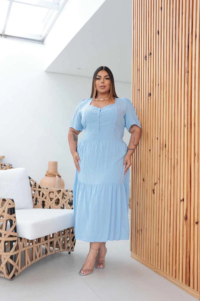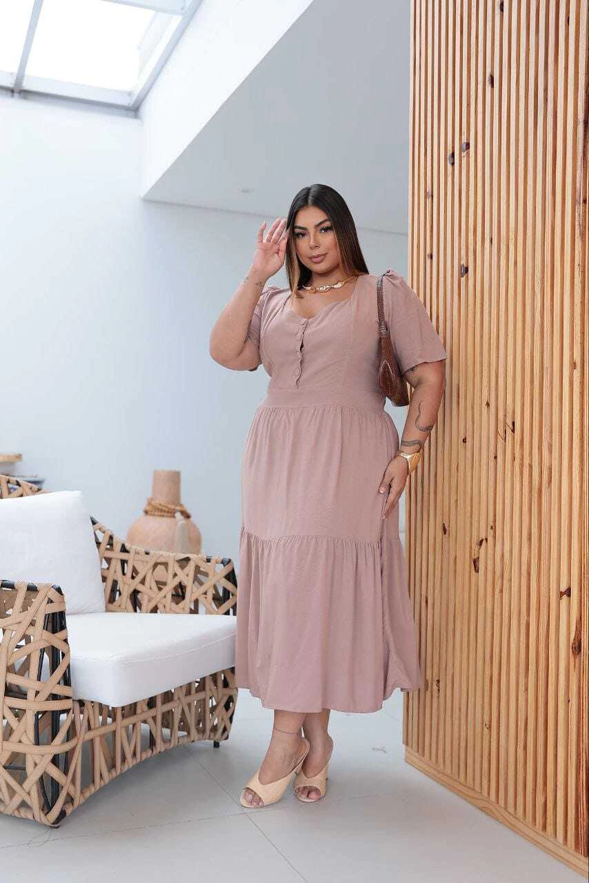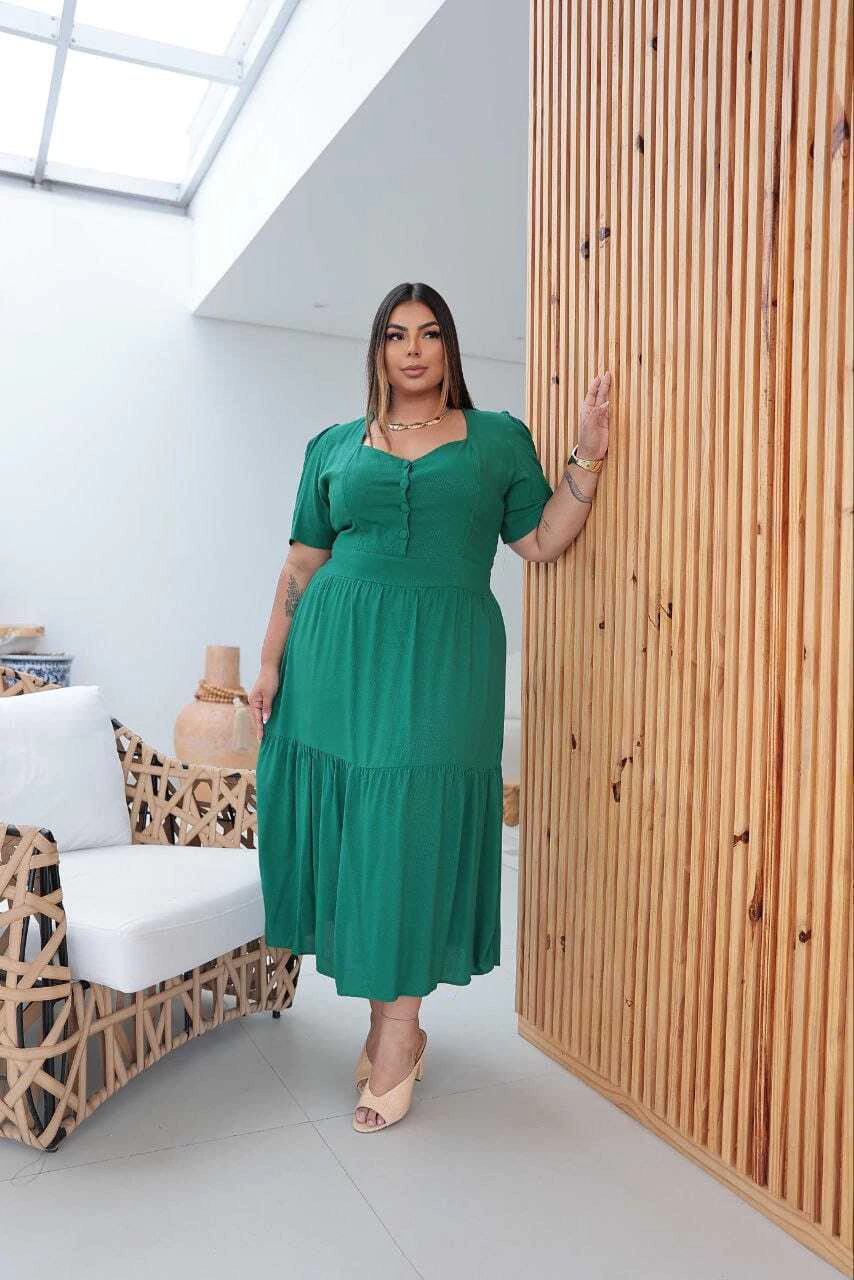 Descubra o Vestido Flora Liso, confeccionado em viscose maquinetada pré-lavada, perfeito para quem busca conforto aliado à elegância. Disponível em plus size (46, 48 e 50), apresenta botões funcionais e costas com ajuste elástico para melhor caimento no corpo. Com dupla camada no peito e forro na saia, garante sofisticação e conforto para qualquer ocasião. Ideal para valorizar sua beleza com estilo e praticidade.